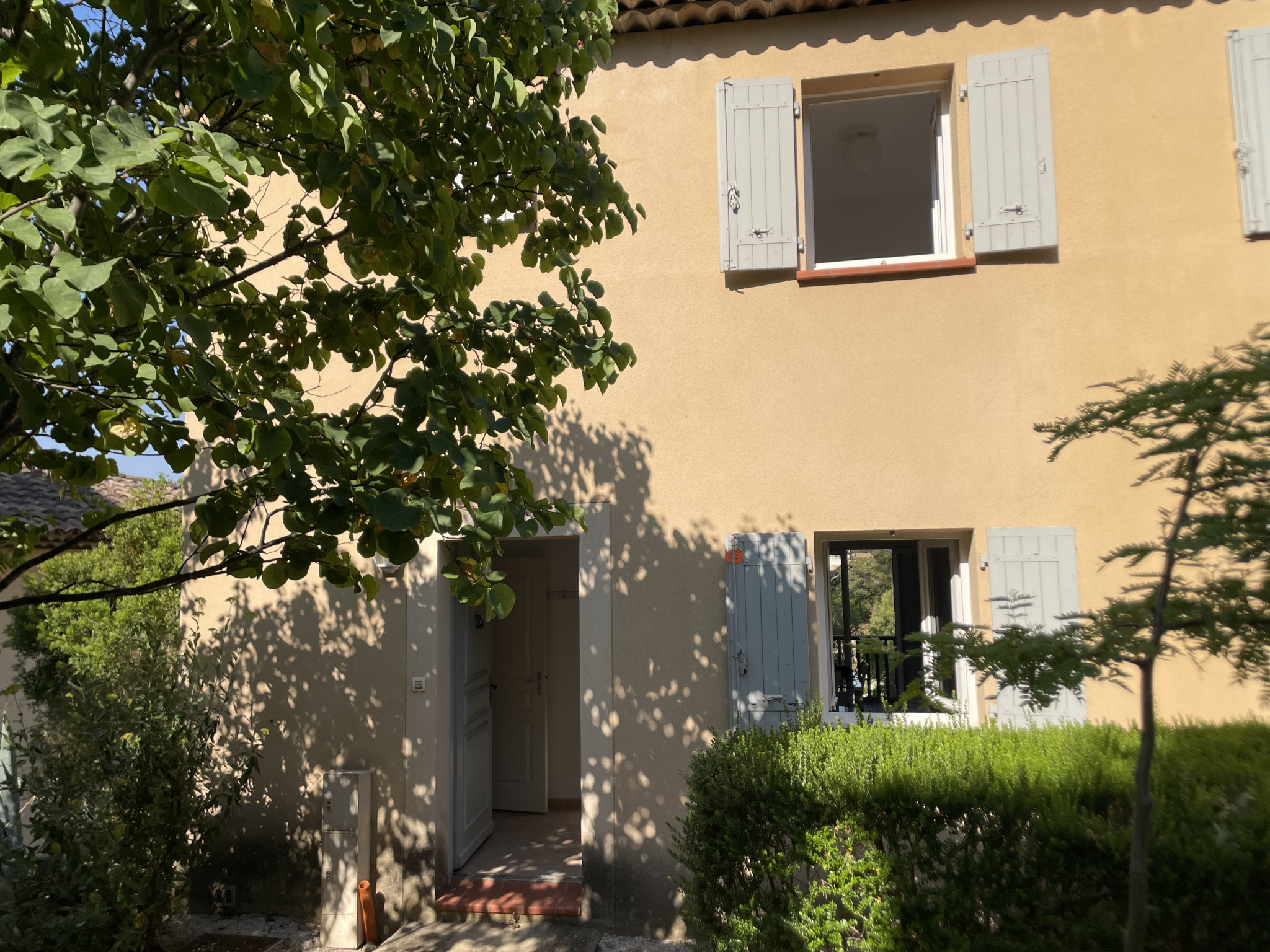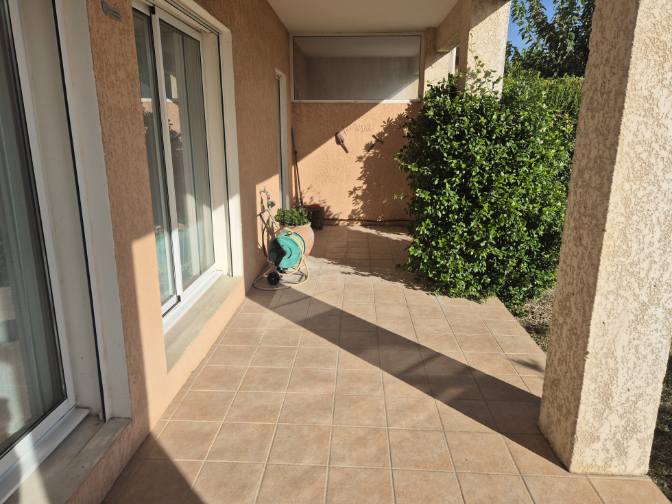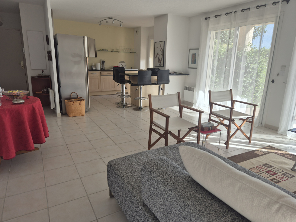 Saint Cannat, dans résidence sécurisée superbe type trois en rez de jardin comprenant une entrée avec placard, un salon avec cuisine américaine équipée, 2 chambres avec placards,une salle de bains, un w-c, une terrasse plein sud, un jardin de 200m² et deux places de parkings en sous sol.